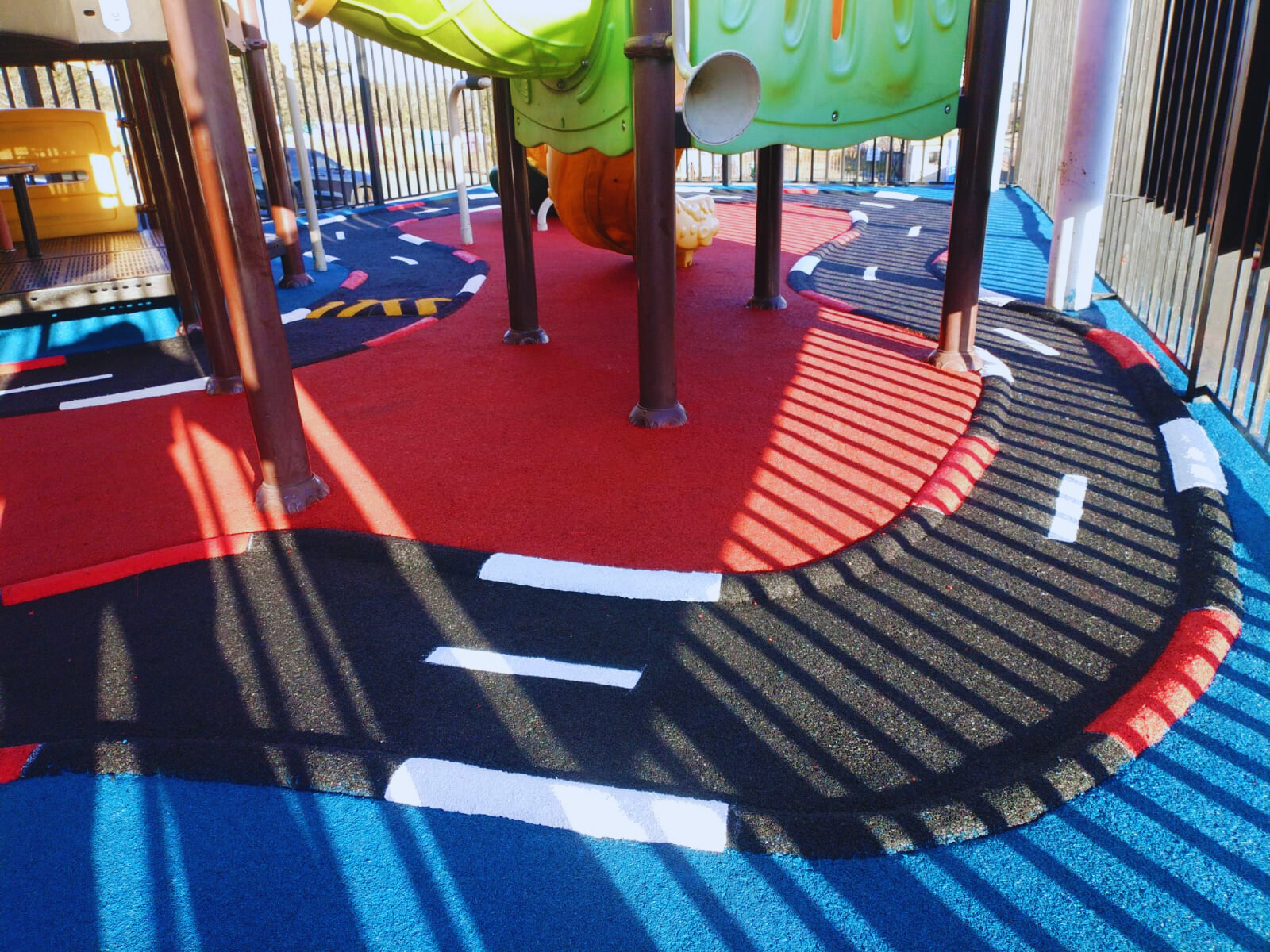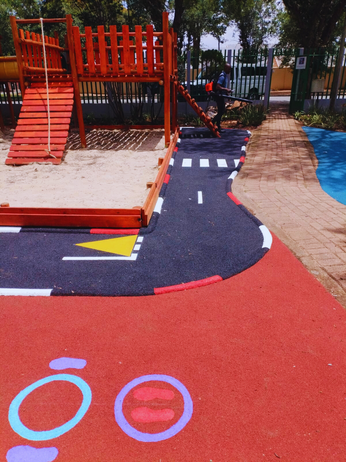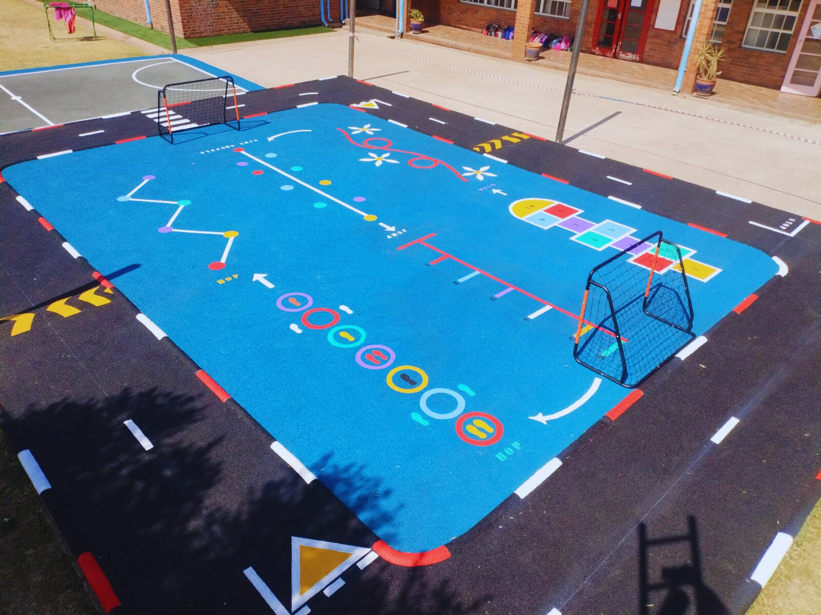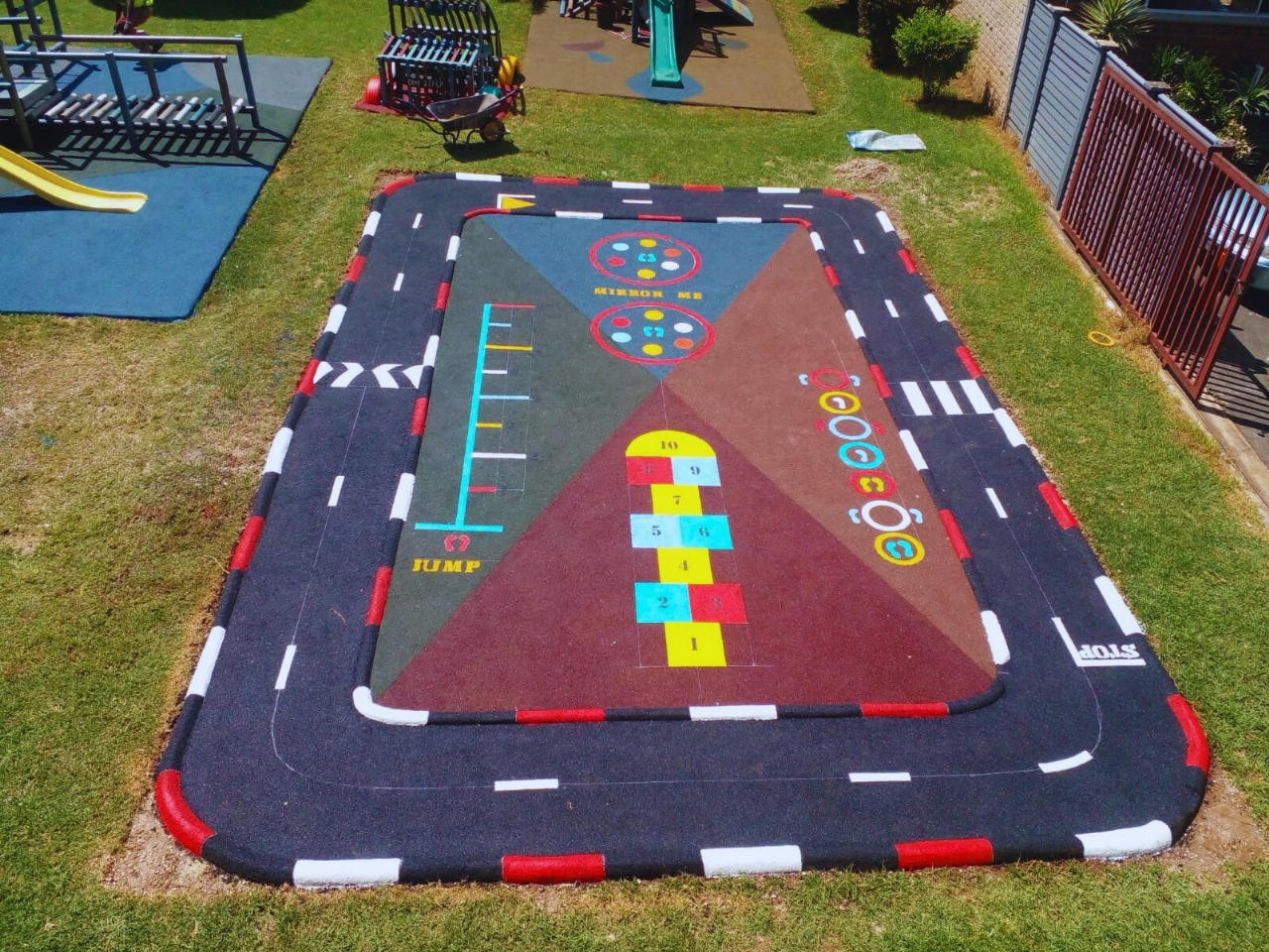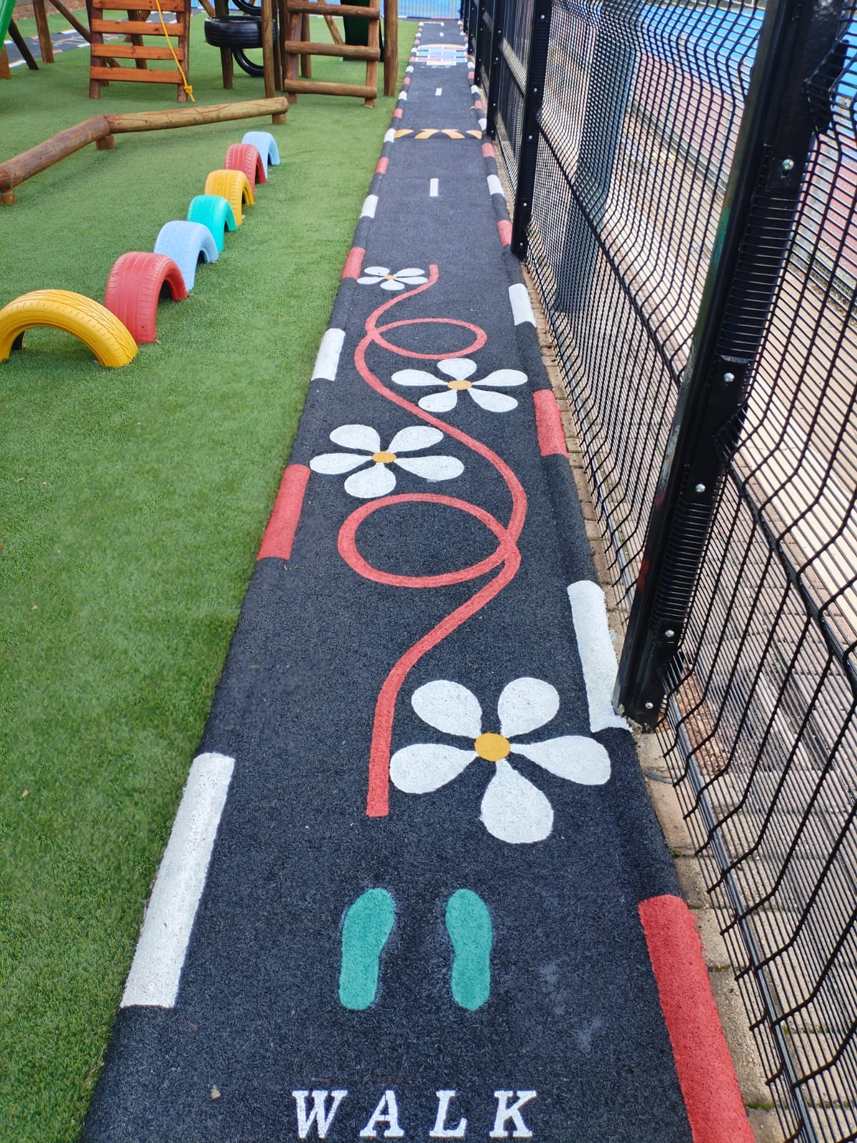 Wet-Pour rubber surfaces can also be used to create sports surfaces such as running tracks, multi-purpose game areas, daily mile tracks, kid's mini cycle tracks and other playground flooring designs.